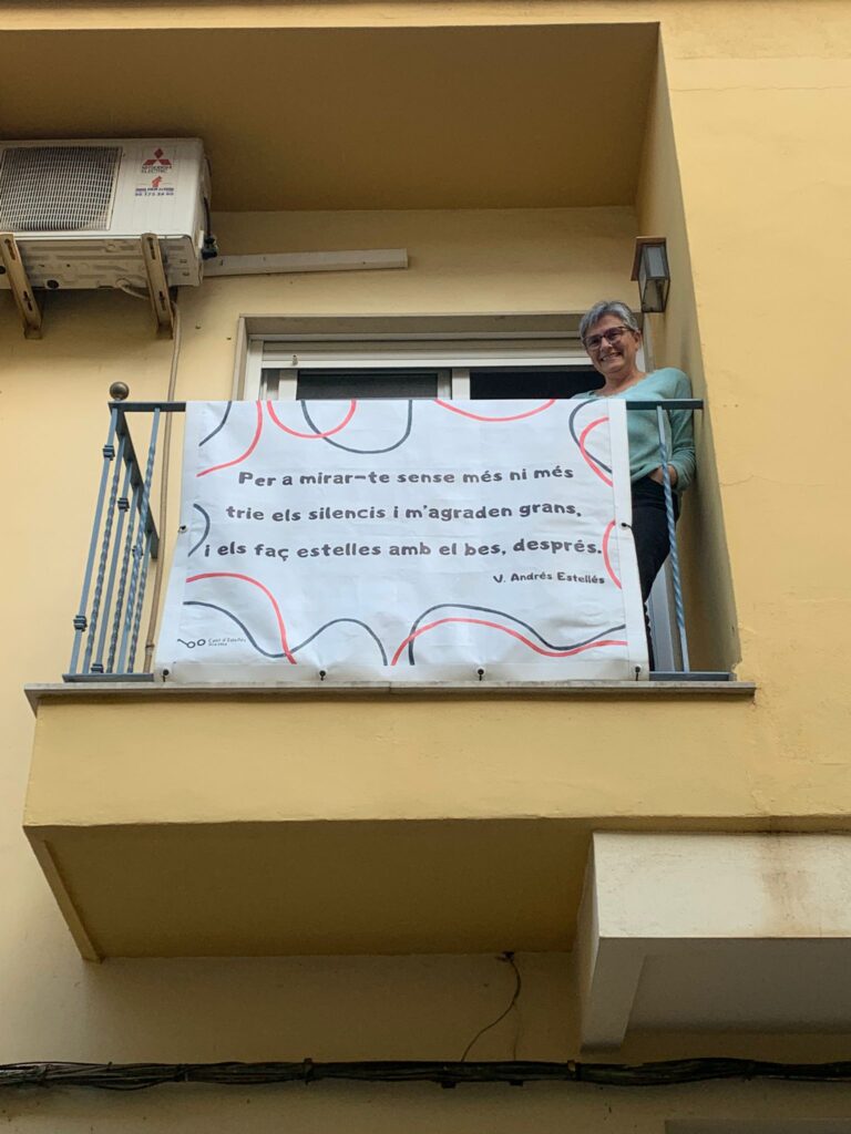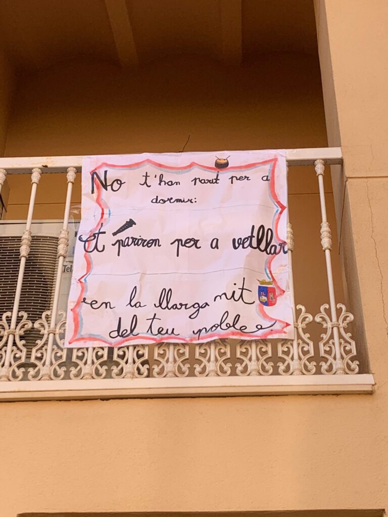 Després d’una setmana els nostres versos continuen als balcons. Ahir férem la segona passejada amb més de 50 poemes penjats al llarg del poble i acompanyats amb tabals i dolçaines.